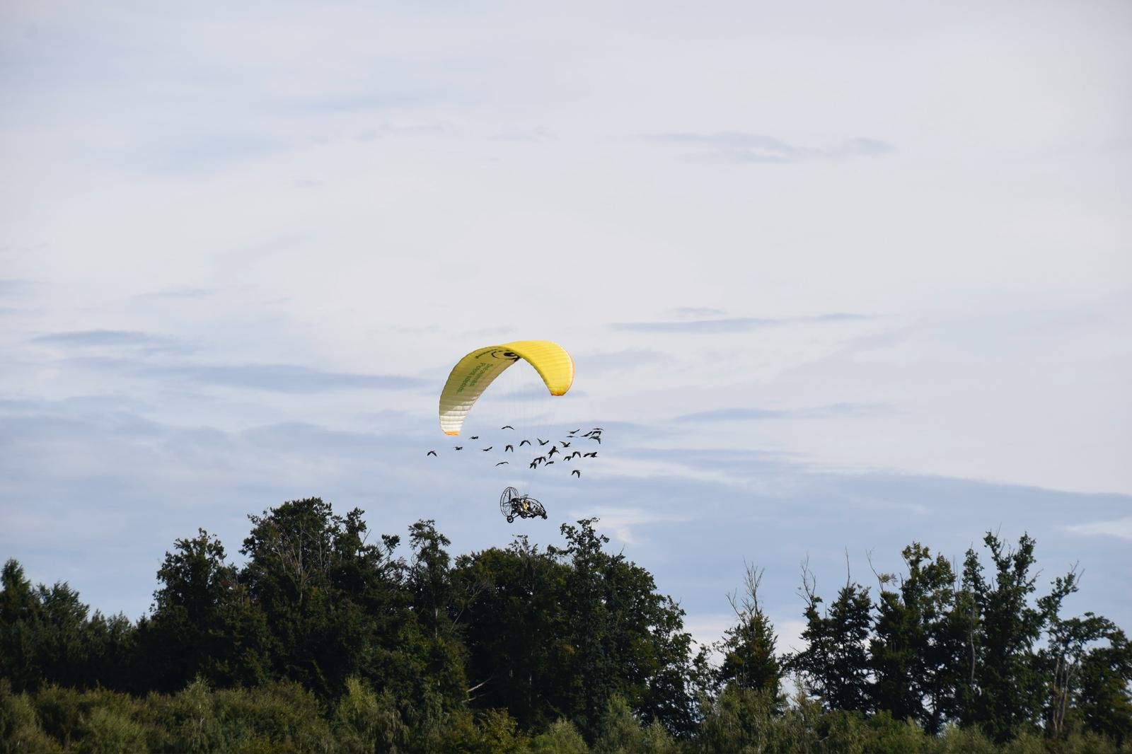 Gestern war ein ereignisreicher und ermutigender Tag. Alle Vögel folgten uns wunderbar vom Flugplatz Kißlegg – endlich! Das Team spürte zum ersten Mal aufkommende Migrations-Stimmung. Die Vögel folgten zuverlässig: teilweise dicht am Fluggerät, teilweise in einer separaten Gruppe, und zeigten erste Anzeichen einer energieeffizienten Flugformation.