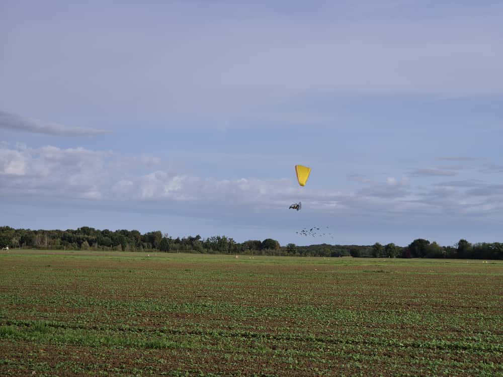 Das Fluggerät fährt mittlerweile schon mit Schirm auf der Wiese auf und ab und die Vögel folgen den Rufen der Ziehmutter, die mit unserem Piloten im Fluggerät sitzt. Da das Training super läuft, sind es nur noch wenige Tage, bis das Fluggerät abhebt und das Training in der Luft beginnen kann!