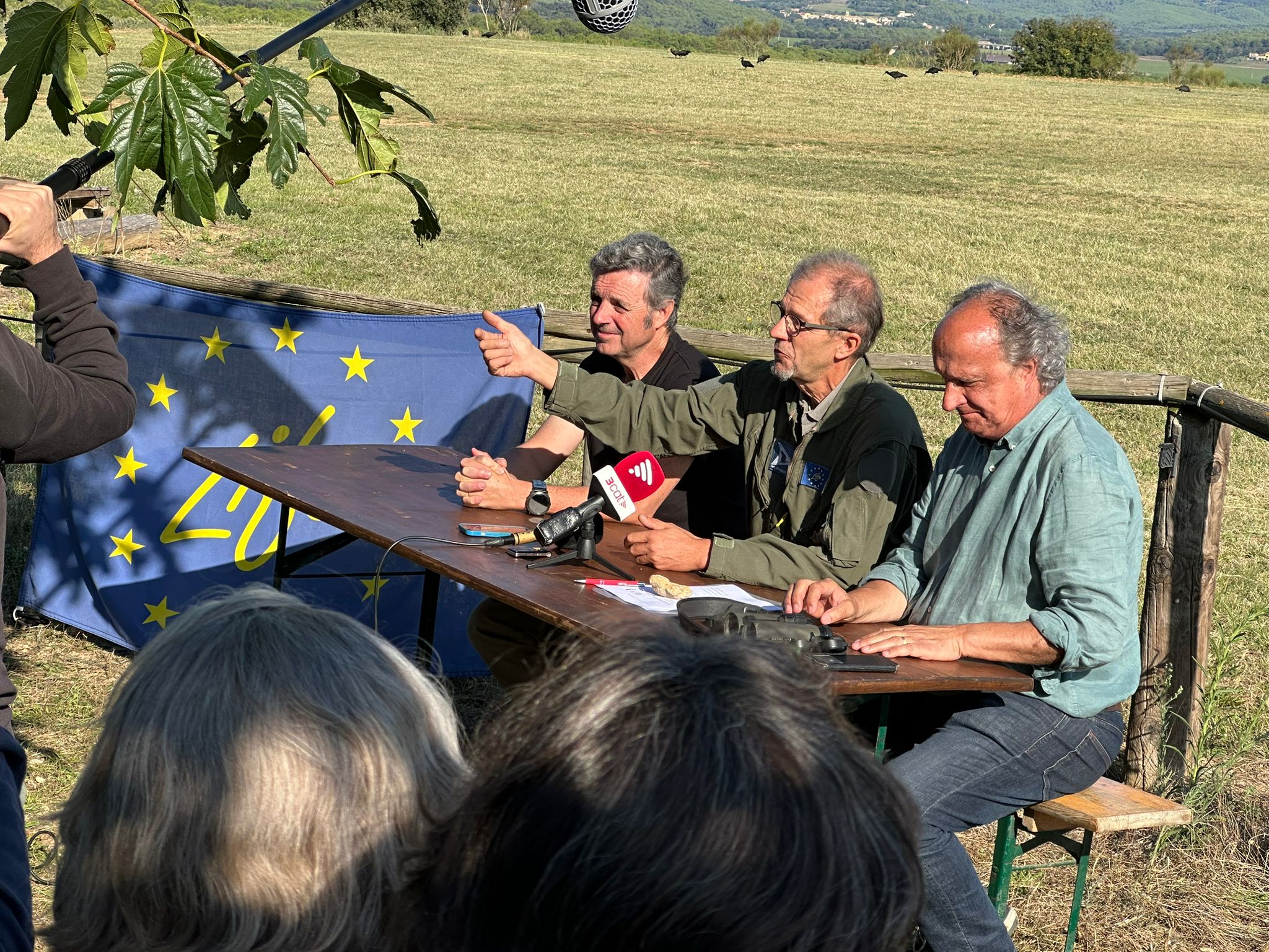 Bei strahlendem Sonnenschein wurden wir in Ordis empfangen. Nach einem kurzen Flug direkt am Platz, der den Vögeln zur weiteren Orientierung dienen sollte, wurde im Rahmen einer Pressekonferenz unsere Ankunft in Katalonien verkündet. Mit der Unterzeichnung eines Memorandum of Understanding wurde die Zusammenarbeit zwischen dem Waldrappteam und der Alive Foundation offiziell besiegelt.